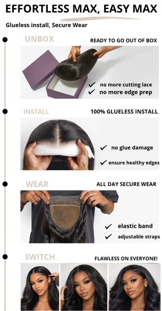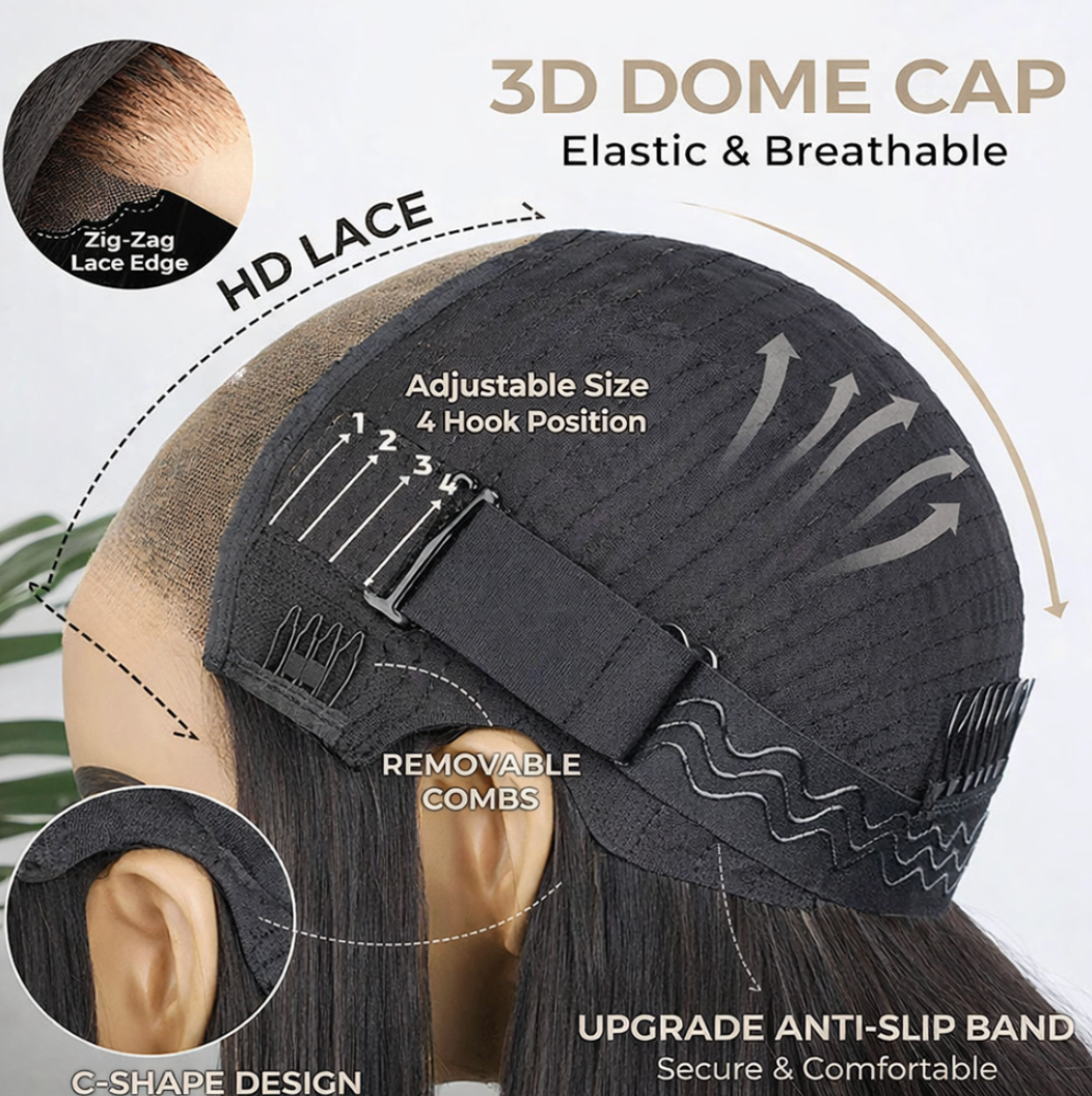 Unlike traditional wigs with glue or combs that pull on your scalp, our wigs feature a 3D breathable cap with no harsh adhesives, making them super lightweight, comfortable, and irritation-free, even for sensitive scalps.